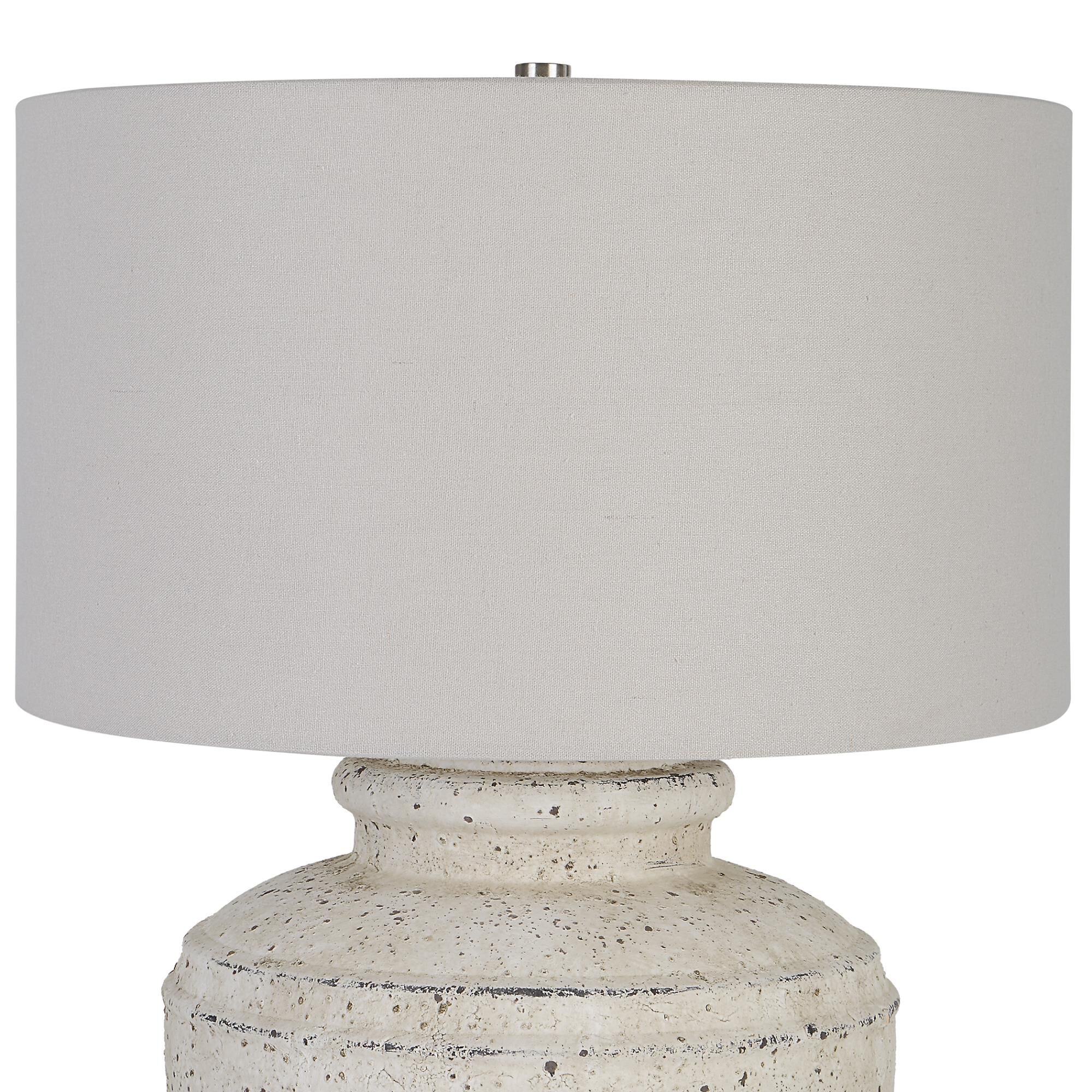 Inspired By Antique Pottery, This Ceramic Table Lamp Features An Aged Stone Finish With Character Distressing And Dark Undertones, Accented With Plated Brushed Nickel Details. The Drum Shade Is Covered In A Light Gray Linen Fabric.