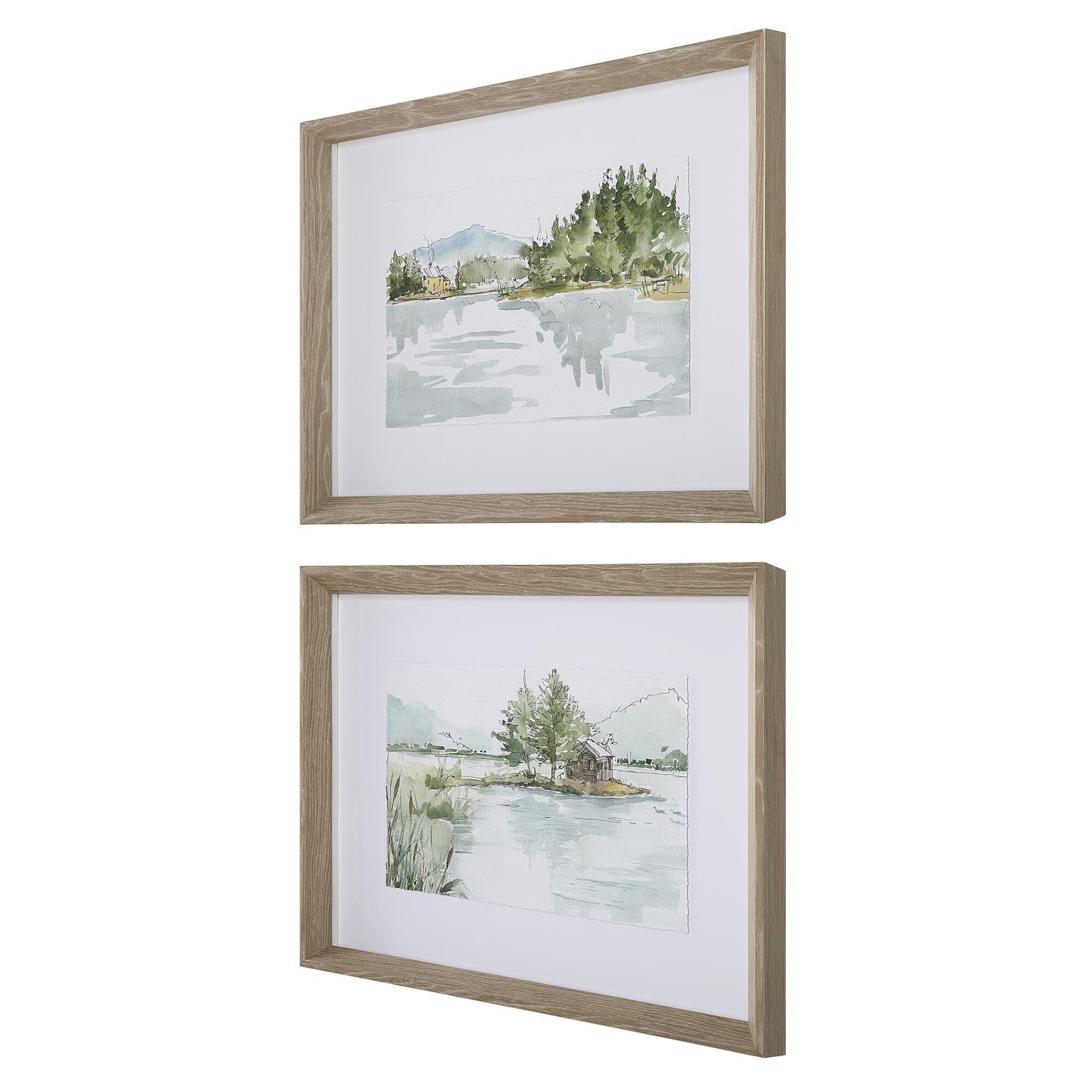 Inspired By Serene Lake Views, these Watercolor-Style Sketches Display Tranquil Shades of Smokey Blues, Olive Greens, and Mustard Yellows. Each Landscape Is Accented By a White Background and An Gray Washed Pine Frame Under Glass. Artwork By Anne Tavoletti.